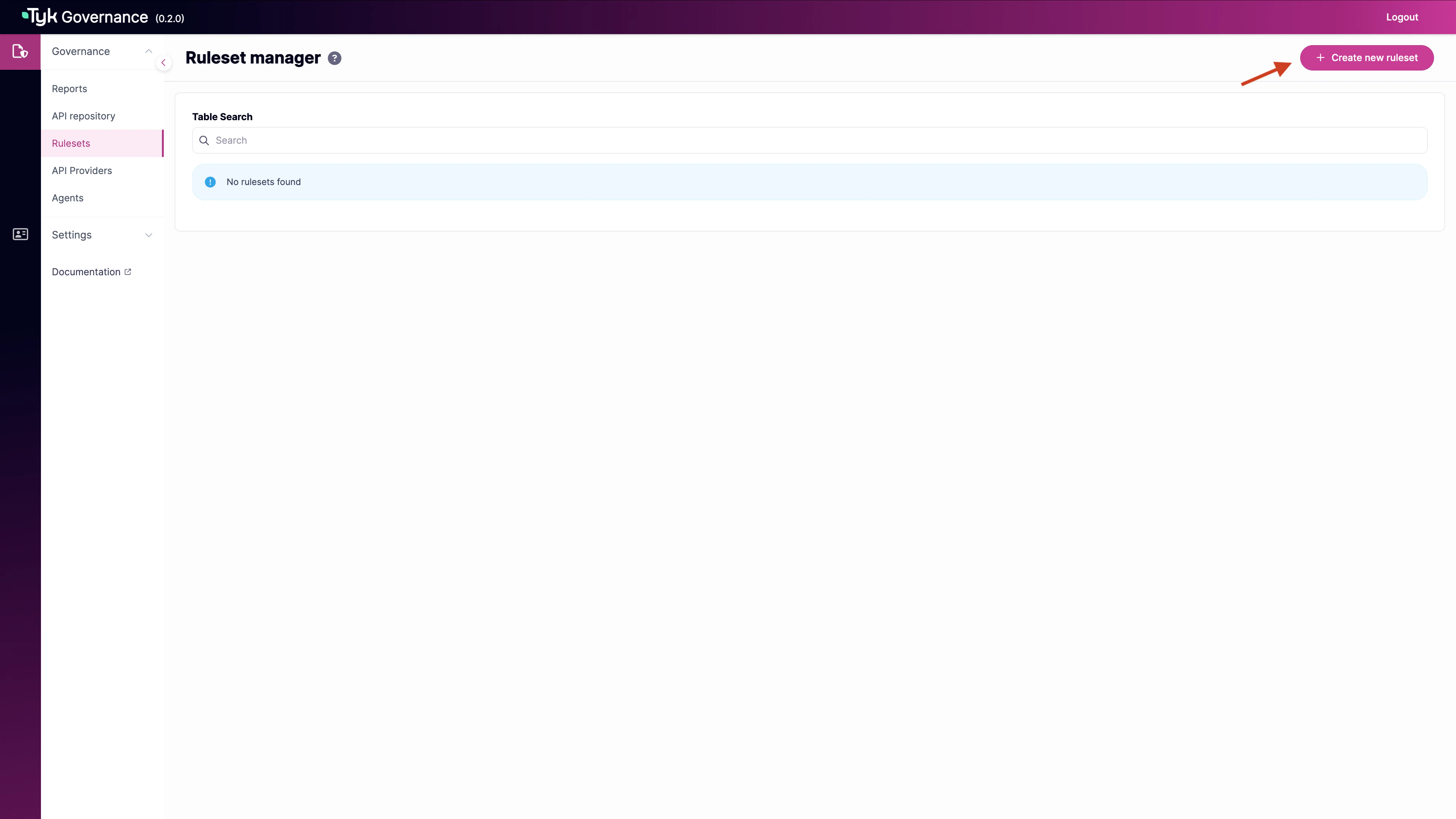 1. Access the Rulesets Section Navigate to the Rulesets section in your Tyk Governance dashboard.